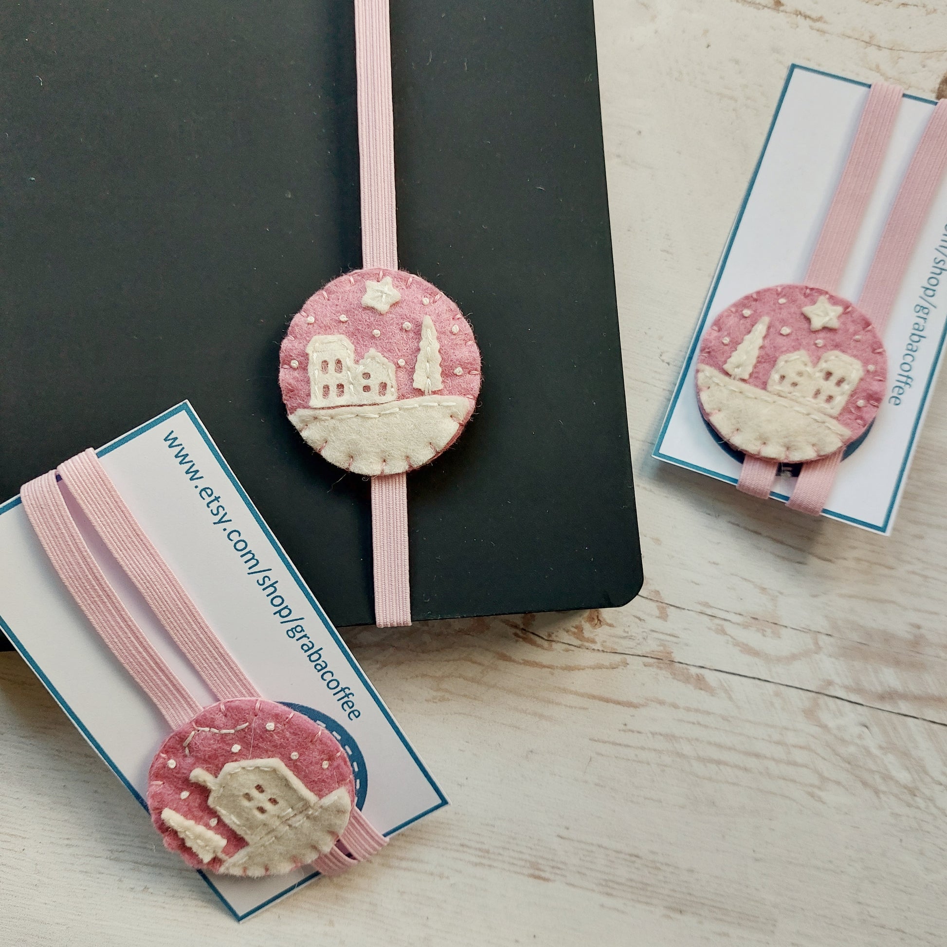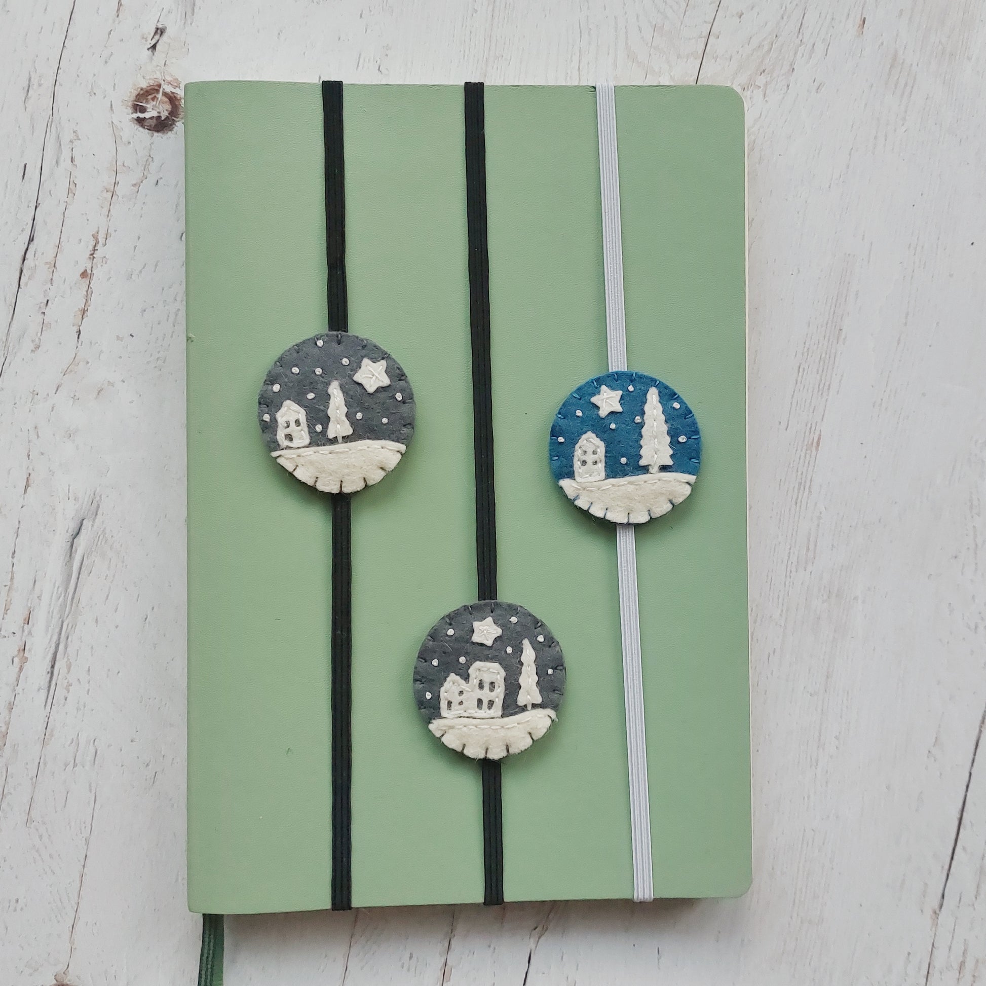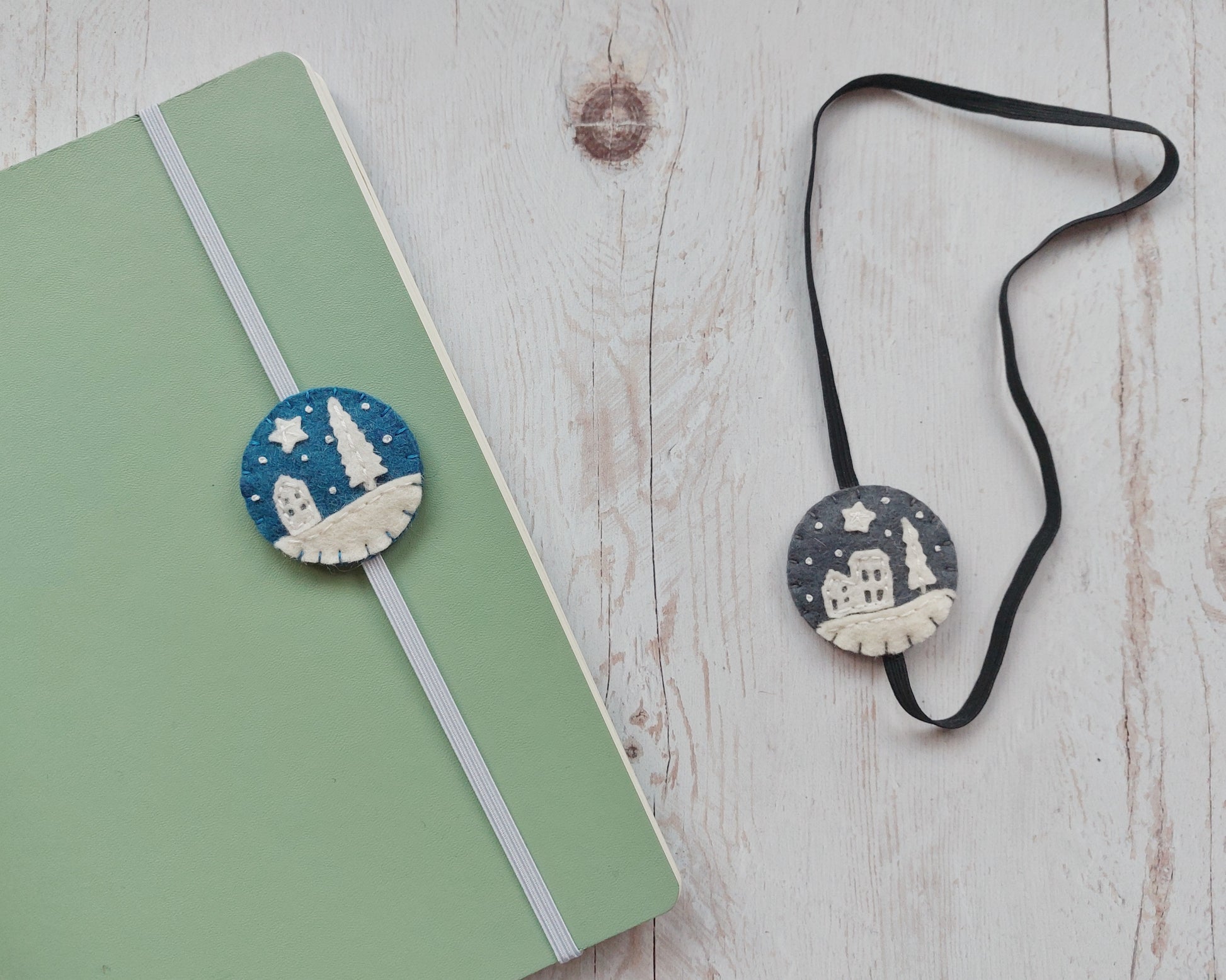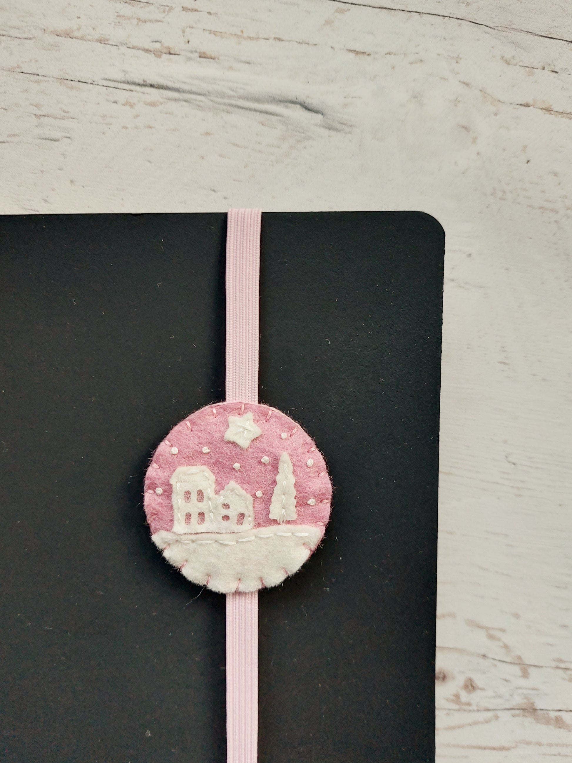 Round shaped felt bookmark with small white winter-y design (white houses and trees) - made with wool-blend felt, and elastic ribbon. It fits mainly to A/5 books or planners.