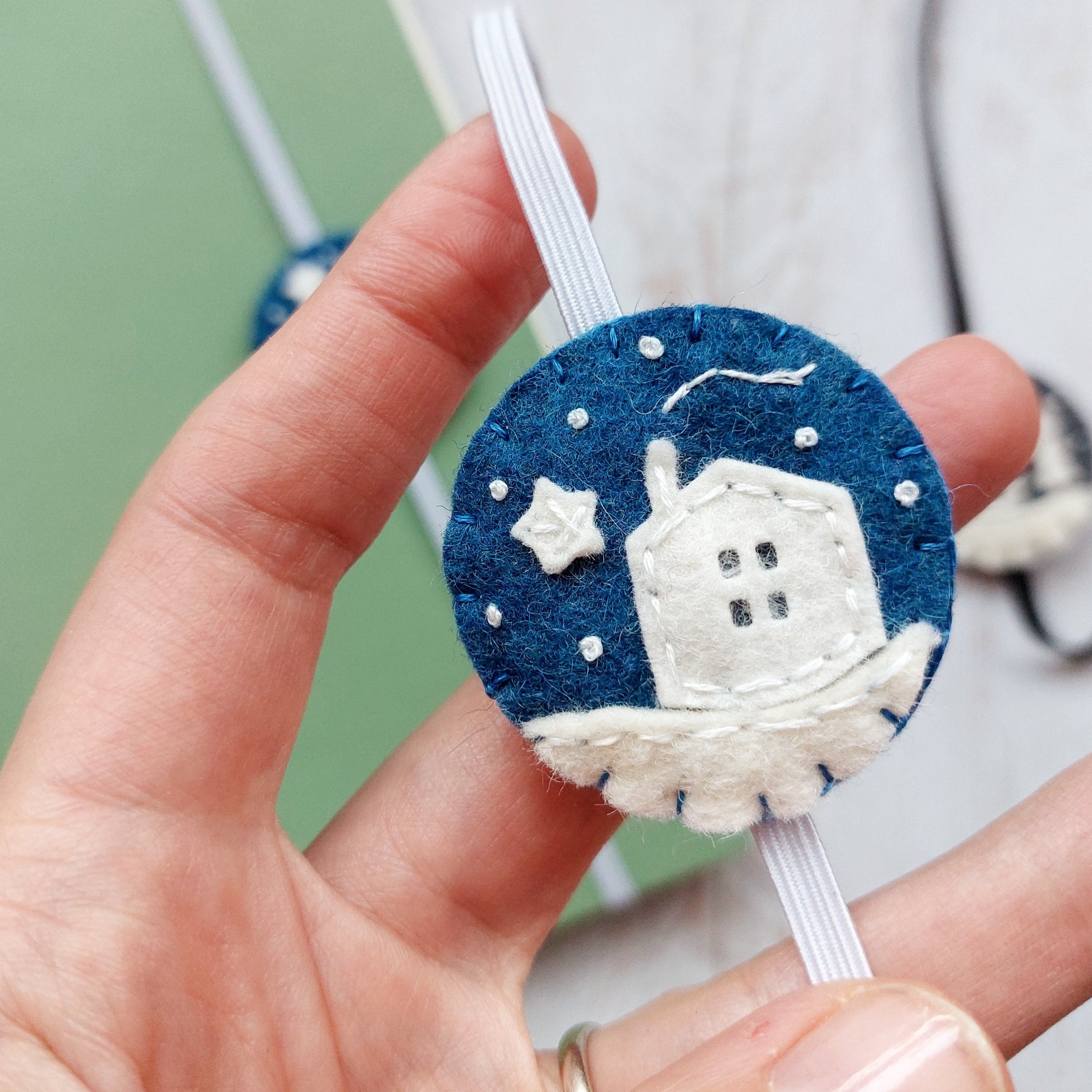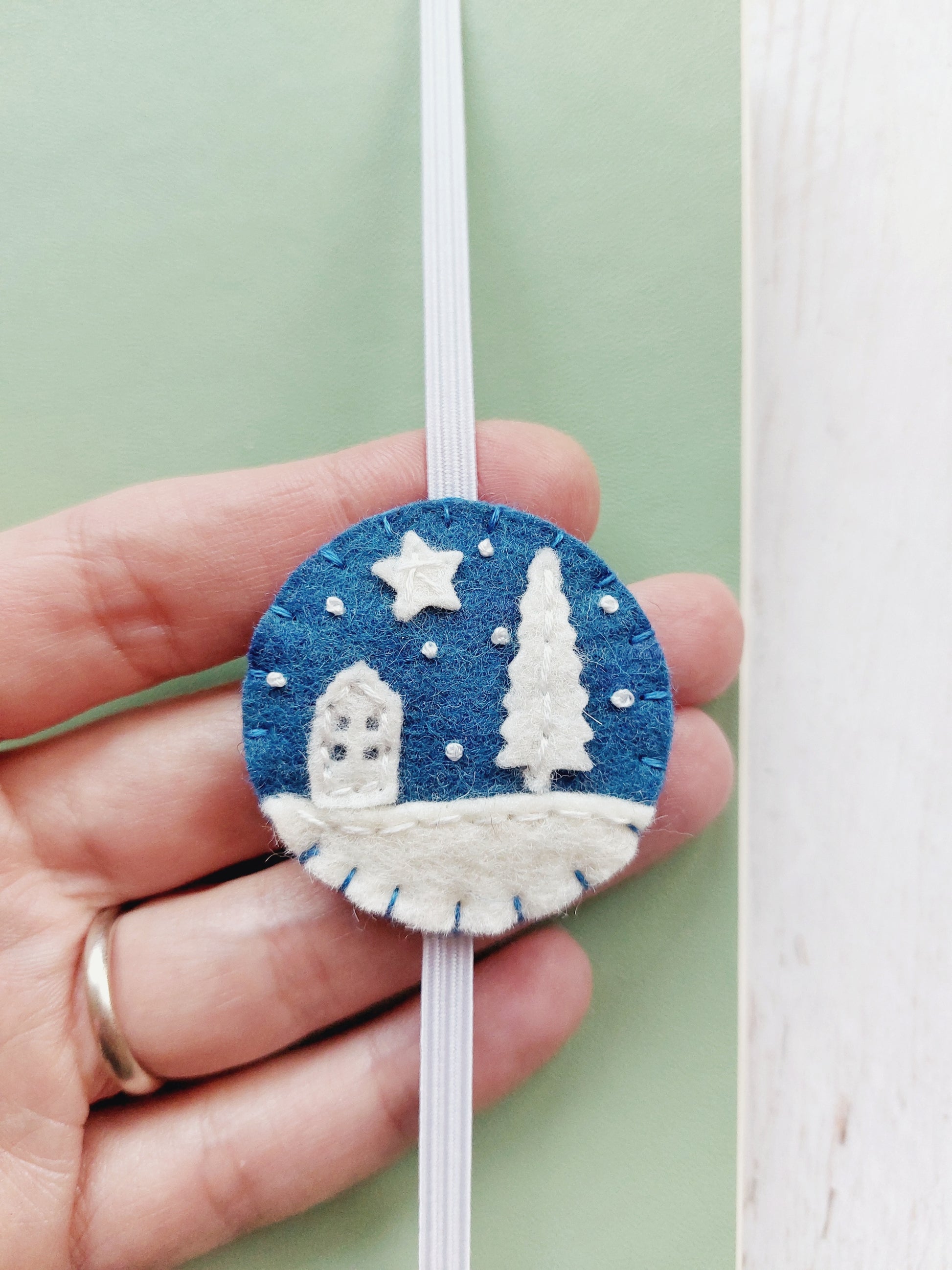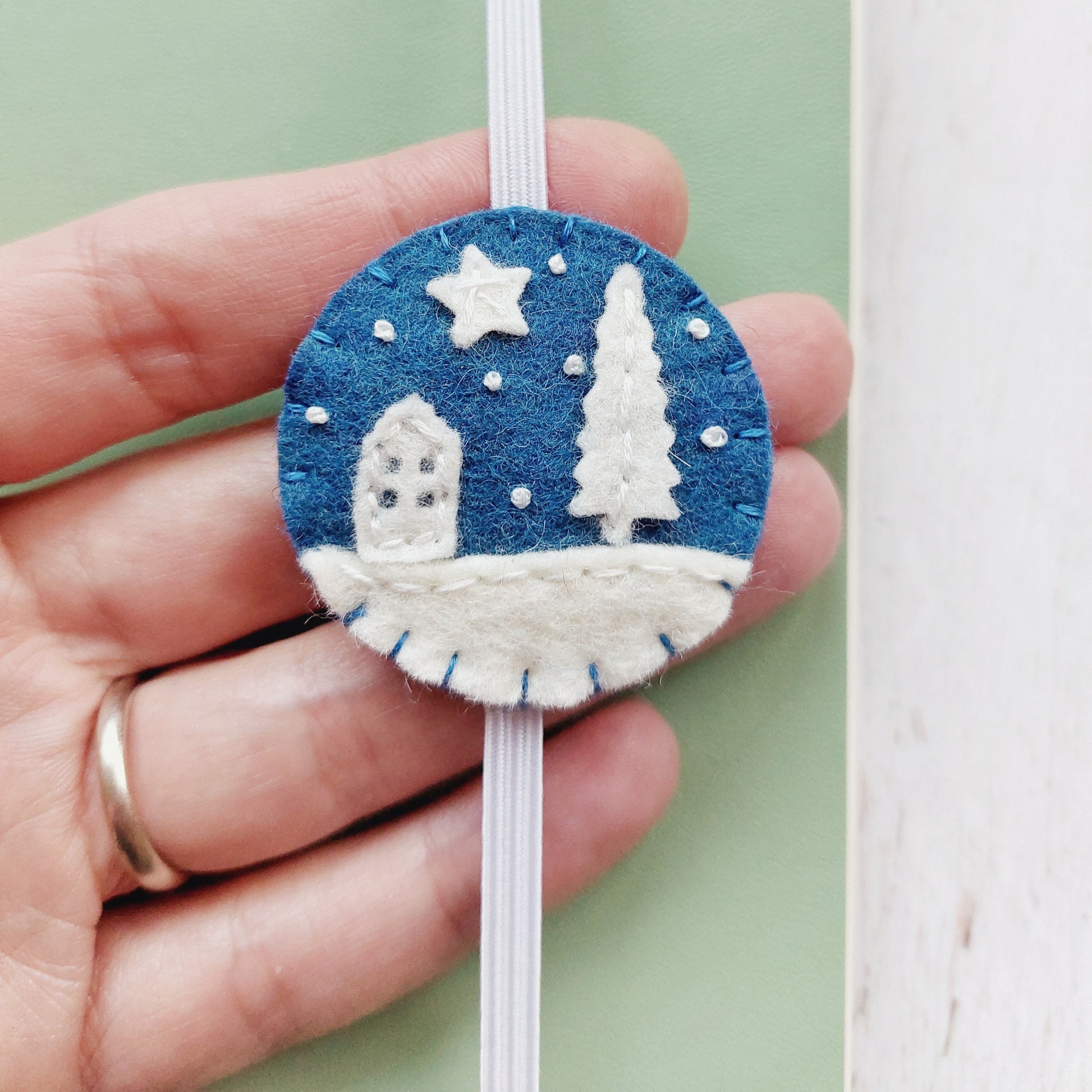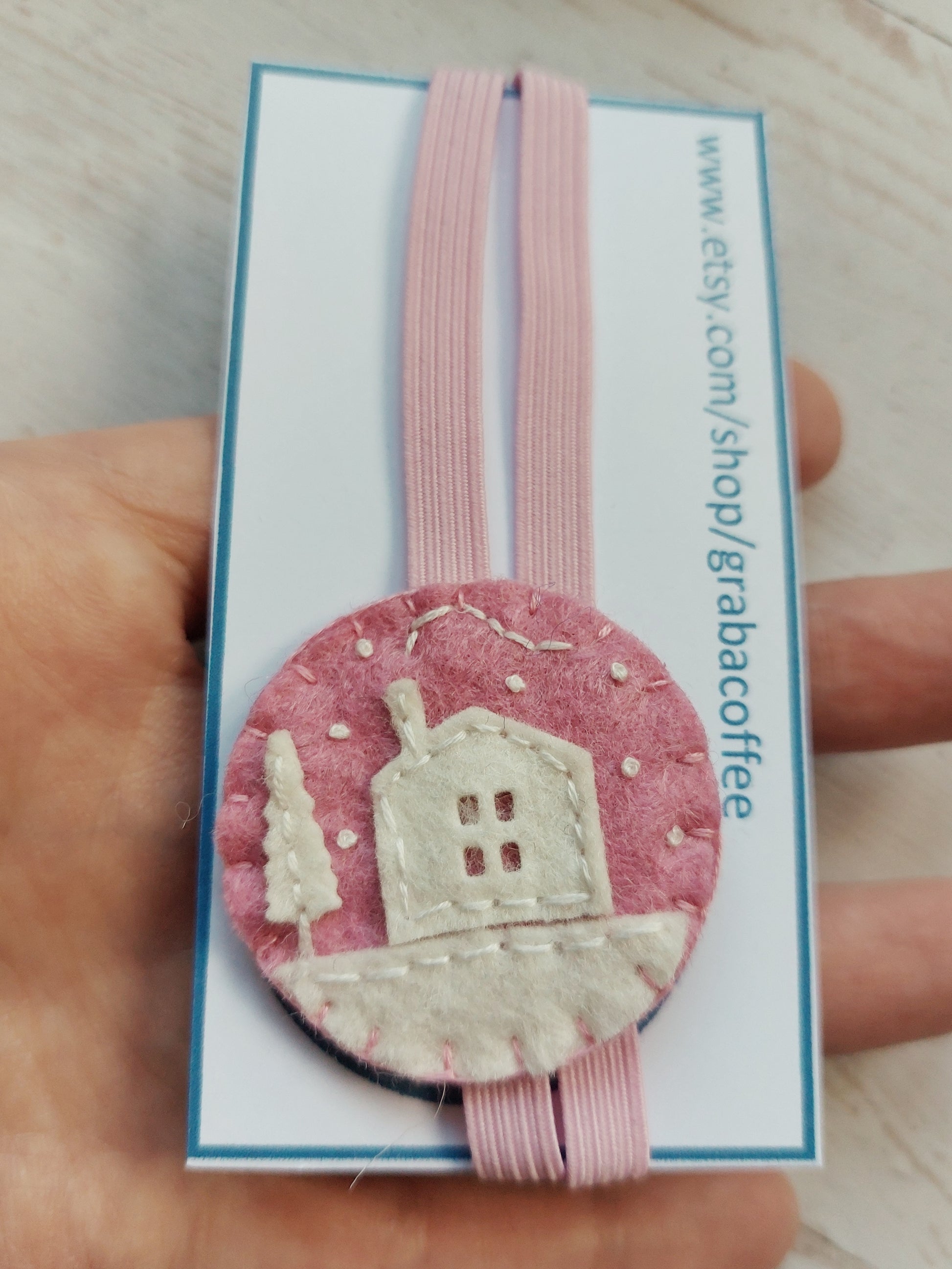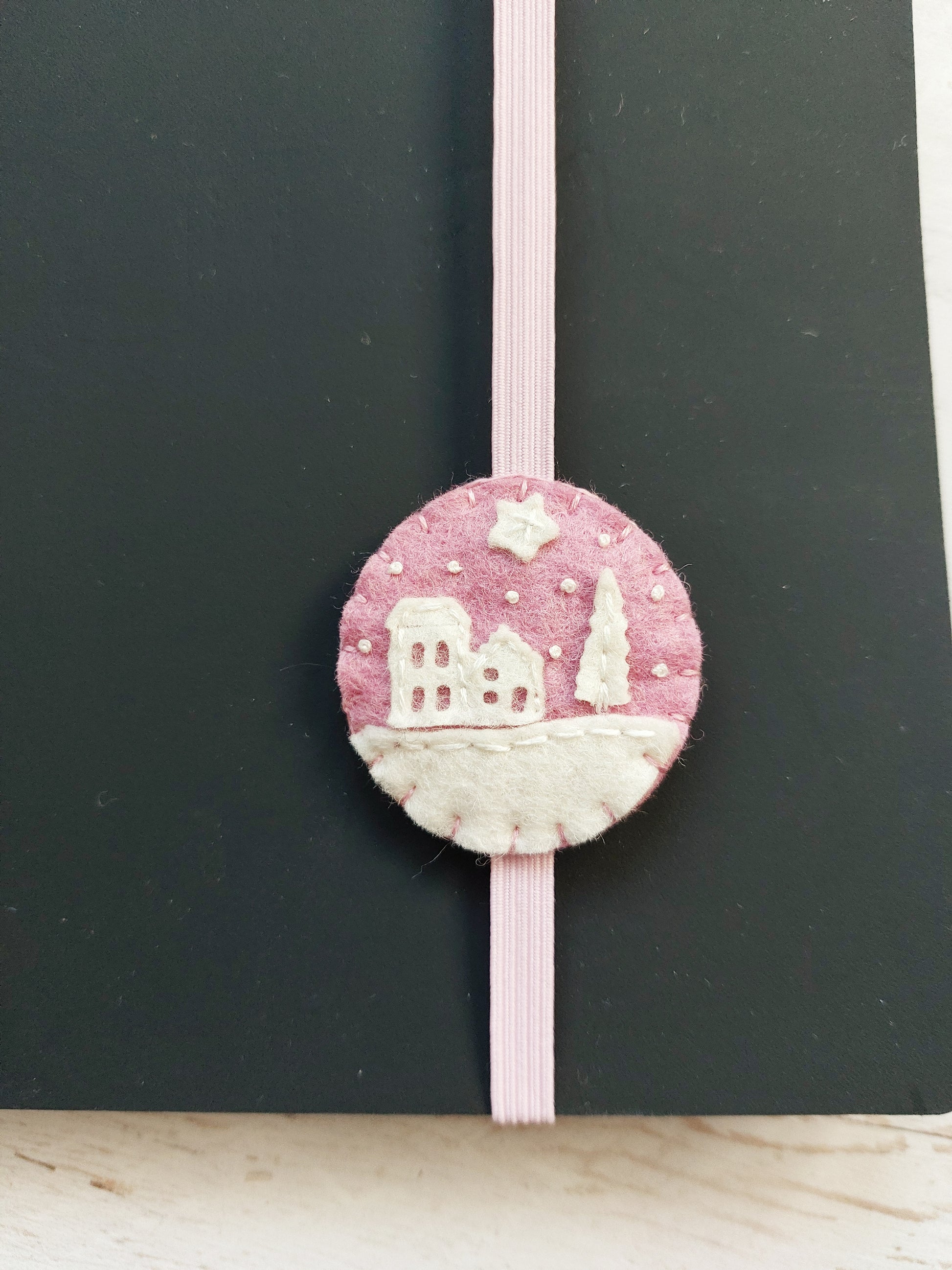 Round shaped felt bookmark with small white winter-y design (white houses and trees) - made with wool-blend felt, and elastic ribbon. It fits mainly to A/5 books or planners.